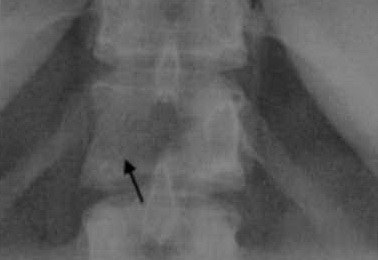 Женщина 34 лет с метастазами карциномы молочной железы. На рентгенограмме позвоночника в прямой проекции определяется деструкция правой ножки дуги Тh 12.