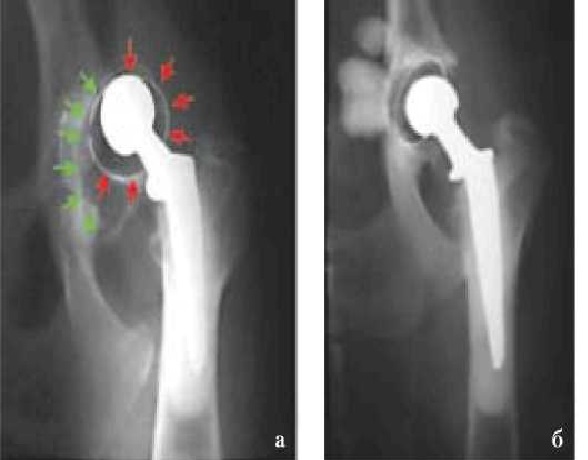 Рис. 1. Рентгенограмма. Вывих вертлужного компонента эндопротеза ( смещение чашки показано стрелками) без признаков асептической нестабильности (а). Ревизионное эндопротезирование с повторной фиксацией чашки эндопротеза (б)