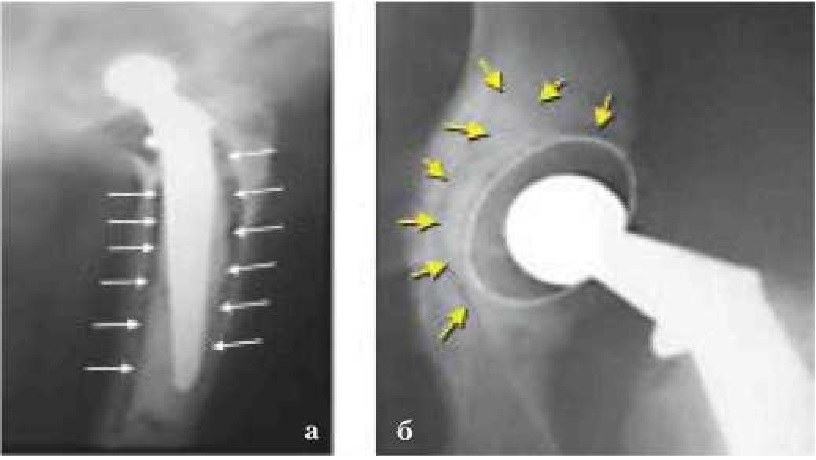 Рис. 2. Рентгенограмма. Асептическая нестабильность бедренного (а) (ножки) и вертлужного (б) компонента (чашки) эндопротеза. Стрелками показано разрушение костной ткани (остеолиз)