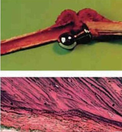 Гистологические исследования показали, что при стабильном протезе на границе кортикального слоя кости и цементной мантии образуется соединительнотканная мембрана толщиной 0,3. 0,5 мм, состоящая из пучков зрелых коллагеновых волокон различной толщины. Клеточные элементы соединительно-тканной мембраны включают в себя фибробласты и немногочисленные гистиоциты (рис. 5).