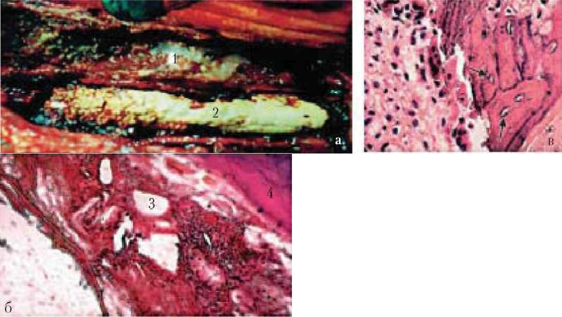 Рис. 6. Бедренный компонент эндопротеза при асептической нестабильности (а): 1 —соединительно-тканная капсула; 2 — цементная мантия. Соединительно-тканная капсула (3) между губчатой костью (4) и цементом, состоящая из коллагеновых волокон различной степени зрелости. Окраска гематоксилином и эозином, х 160 (б). Резорбция кортикальной пластинки остеокластами (показаны стрелками) и гистиоцитами, х 400 (в).