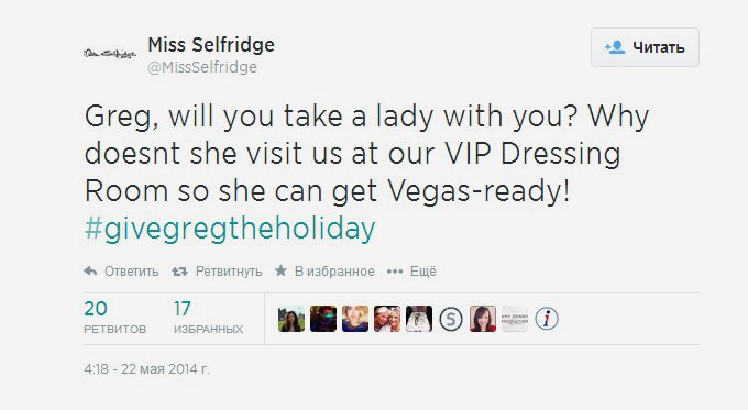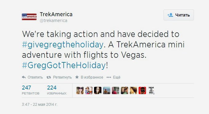 Руководитель SMM-отдела в креативном агентстве Red Keds В последнее время меня впечатляют не масштабные SMM-кампании с огромным бюджетом, а небольшие, практически бесплатные активности брендов, которые улавливают момент, быстро и креативно реагируют на тренд или событие. Порой охват и PR-эффект от этого сравним с многомиллионной медийной кампанией. В конце мая произошёл подобный случай в Великобритании. Twitter-хэштег #GiveGregAHoliday вышел в тренды микроблога по всему Евросоюзу. Это случилось после того, как охранник в Arcadia Retail Group по имени Грег случайно разослал своё заявление на предоставление отпуска 3 500 сотрудникам фирмы. Большинство пользователей просто поржали над новостью в соцсетях, а американская компания TrekAmerica быстро среагировала и подарила Грегу бесплатную поездку в Лас-Вегас. Об этом написали интернет-издания, компания получила огромный бесплатный охват. Следом подключились и другие бренды: например, предлагали Грегу и его девушке бесплатную одежду в поездку. По-моему, всё это мило, креативно, а главное — практически бесплатно для компаний.