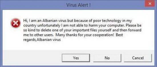 "Я- Албанский вирус, но в связи с очень плохим развитием технологии в моей стране, я к сожалению не могу приченить вред вашему компьютеру.