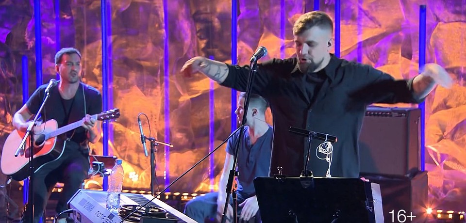 Баста пришел на программу не с минусом, а с тремя музыкантами. Стоп-кадр из эфира телеканала РЕН-ТВ.