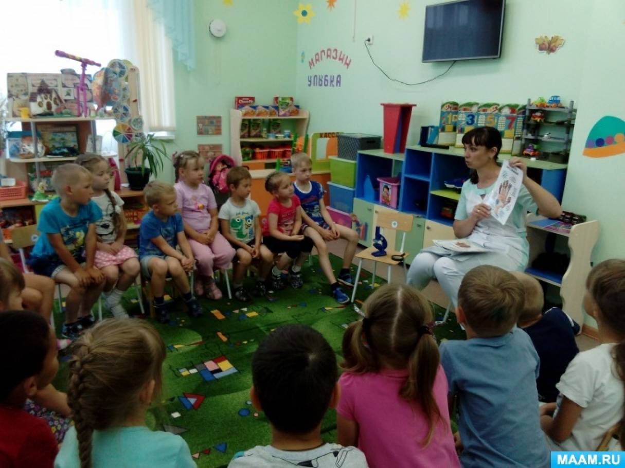Воспитатель: Особенно важно, ребята, следить за чистотой своих рук. Руками вы берете различные предметы, игрушки, карандаши, книжки, вы играете в мяч, гладите животных, притрагиваетесь к различным предметам в туалетных комнатах. На всех этих предметах есть микробы, часто не видимые глазом. А они остаются на коже ваших пальцев. Если брать немытыми руками хлеб, яблоко, конфету, то эта грязь попадает сначала в рот, а потом в ваш организм. С грязью передаются различные болезни от больного человека к здоровому.