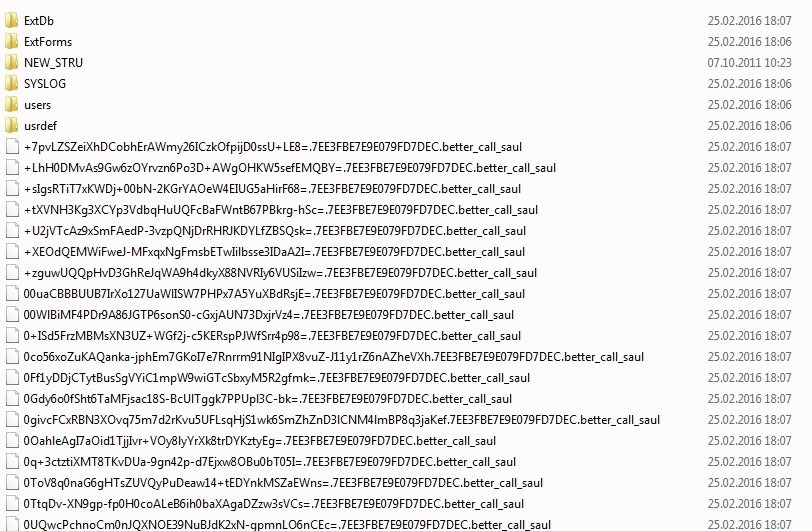 Я глянула в место расположения базенки, вижу, структура каталога та же, зато все файлы переименованы. Ну и сразу поняла, что небо закрыла жопа. Дошла до своего компьютера, зашла на диск с бухгалтерскими данными, так и есть, абсолютны все файлы зашифрованы, имена нечитаемы и у всех одинаковое расширение better_call_saul. Тут же кто-то из сотрудников чухнулся, что в его папке уже на другом сетевом диске наблюдается такая же картина и чуть ли не на глазах файлы сами собой переименовываются. Сразу всем сказали выключить компьютеры и одеть перезервативы.