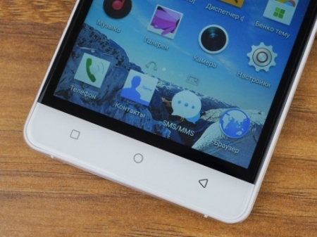 Переднюю сторону гаджета полностью закрывает прочное 2.5D-стекло. Выше экрана — разговорный динамик, справа от него фронтальная двухмегапиксельная камера, слева — датчики. Под экраном — три сенсорные навигационные клавиши без подсветки.
