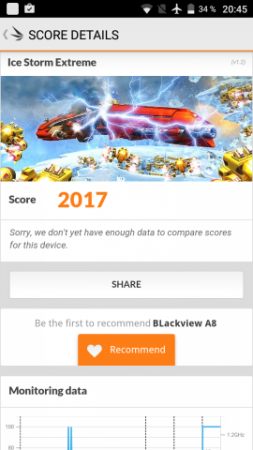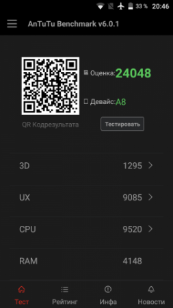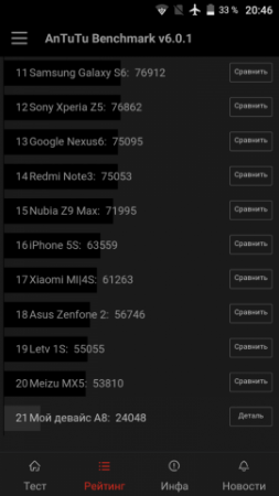 Тест в бенчмарке AnTuTu сообщил, что производительность смартфона A8 оценена в 19677 баллов, что слабо, но жить можно.