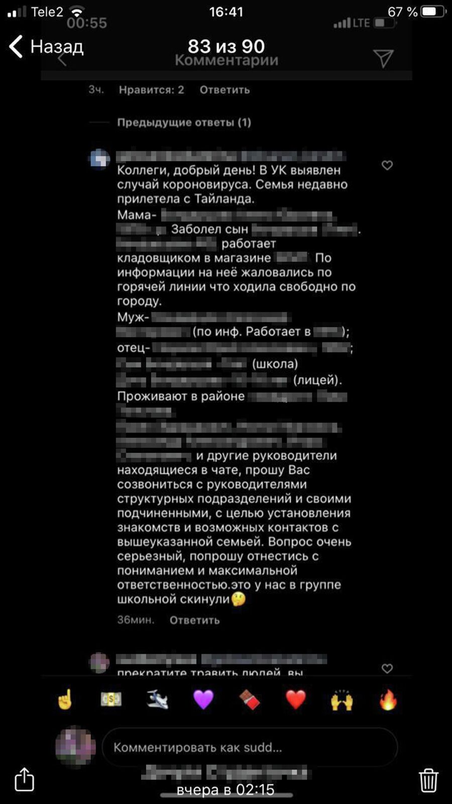 А через несколько дней "досье" на предполагаемого нарушителя — назовем его Алексей — облетело все локальные чаты и группы в соцсетях. В документе был адрес, место работы, даже информация, каким автобусом он прибыл с вахты. С тех пор переживания из-за коронавируса отошли у семьи Алексея на второй план.