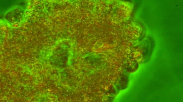 В природных условиях, в общем-то, амебы живут на дне, то есть тоже на какой-то плоскости, иначе они не смогли б никуда уползти, будучи подвешены просто в воде. Щупальца амебы не двумерные, они, скорее, похожи на ладошки - она как бы охватывает ими микроорганизм со всех сторон и формирует вокруг него капсулу (пузырек). Пока формируется капсула, у бедняги ещё есть шанс убежать, но несчастный микроб почти ничего не подозревает. Подозревает он тогда, когда псевдоподии смыкаются слишком плотно, а в фагосому впрыскивается пищеварительный сок. Но тогда становится поздно - со всех сторон еда ограничена стенками пищеварительного пузырька.