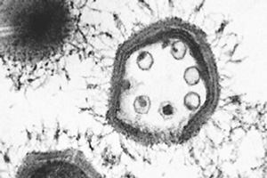 Известен и другой механизм выхода вирионов из клетки: взрывной, при котором оболочка клетки разрывается, и тысячи вирионов отправляются инфицировать новые клетки. Такой способ характерен для аденовирусов, ротавирусов.