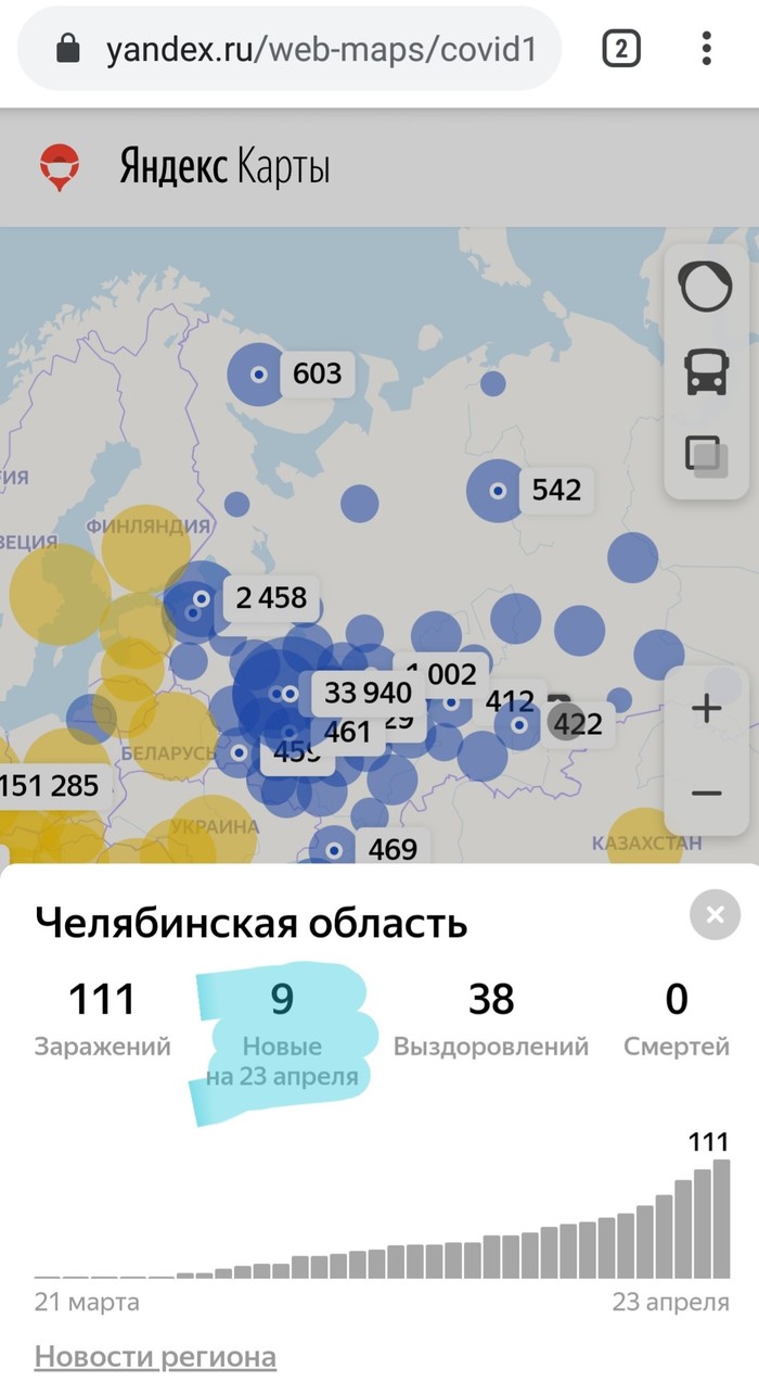Теперь смттрим главную страницу статистики и видим по Челябинской области 9 заразившихся за 23 апреля. Как так то?