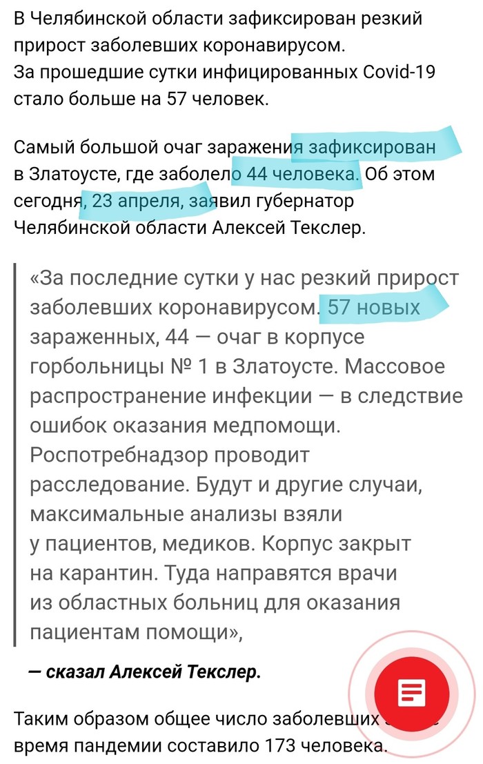 Однако! У нас в области обнаружили очаг в 44 человека в больнице, а всего 57 человек за 23 апреля.