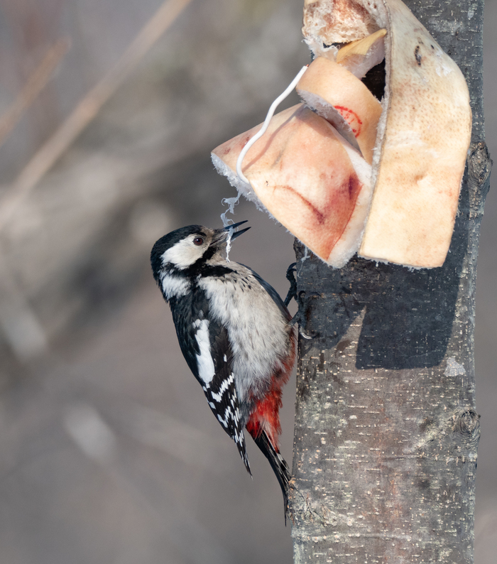 Зимой дятлы часто перемещаются поближе к жилью человека, где питаются на птичьих кормушках или отыскивают корм антропогенного происхождения на помойках. Иногда могут питаться падалью или разорять гнёзда певчих птиц, поедать яйца и птенцов.