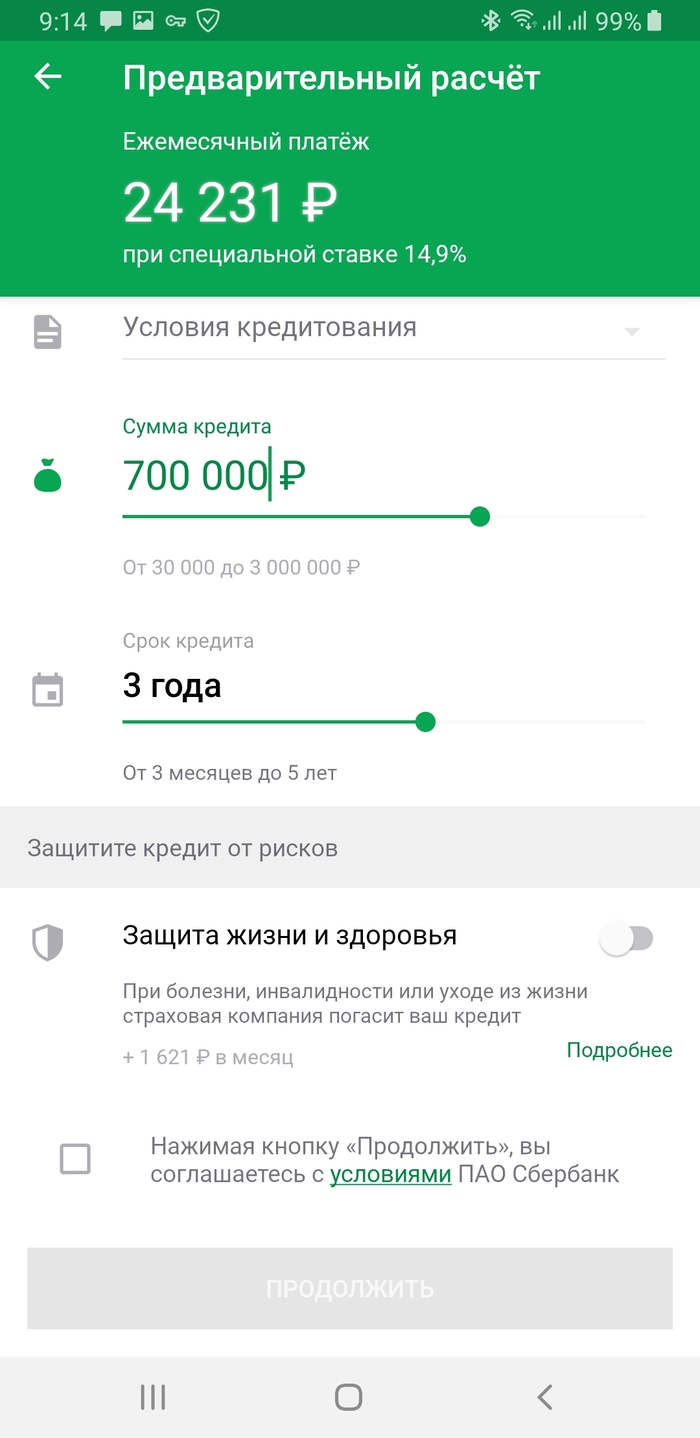 Решил взять кредит 700 тысяч на три года, зашел в офис Сбербанка уточнить все условия. Сразу рассказывают про процентную ставку 14.9% годовых и рассчитывают платёж по кредиту (к сожалению монитор не дали сфотографировать) 27 165 рублей. Говорю мол никаких платежей не включено в этот кредит, на что ответ "включена страховка, но от неё нельзя отказаться и если погасить досрочно кредит то сумму за невостребованный период нельзя вернуть". И настойчиво предлагает оформить заявку (в случае одобрения деньги сразу же упадут на карту т.е. это будет означать что условия кредита приняты).