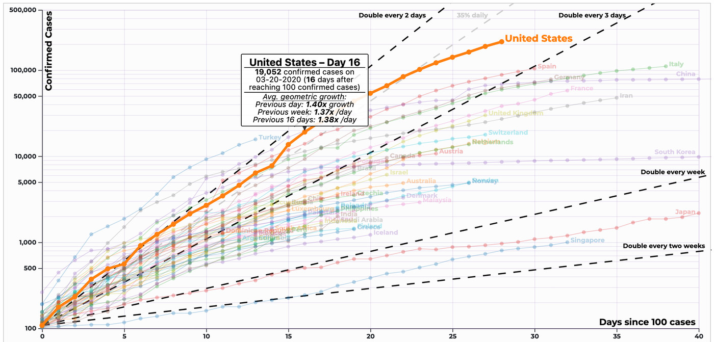 Здесь модель не такая благоприятная. Демонстрируется рост числа заболевших в США в при различных возможных сценариях, таких как ограниченное и полное социальное дистанцирование. Даётся анализ данных по штатам и по странам с анализом принимаемых мер.