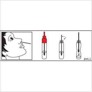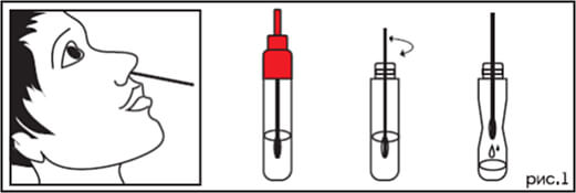 | 1. Взять мазок со стенок носового хода | 2. Внести 15 капель раствора для образца | 3. Вращать тампон в пробирке, выжать жидкость |