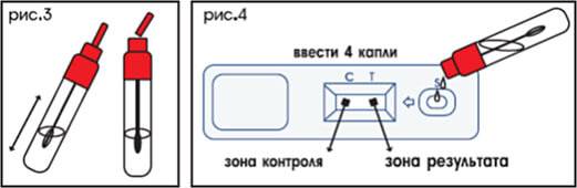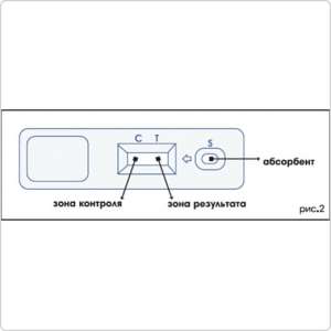 4. Ввести 4 капли из флакона в круглое окошко тест-кассеты, помеченное стрелочкой или S. (См. рис. 4) Прочитать результат через 10 минут.