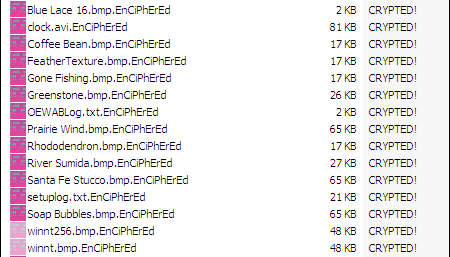 After infecting files. This Trojan will alter the extension with ..EnCiPhErEd and also replaces icon with a common pink image as show in the image below.