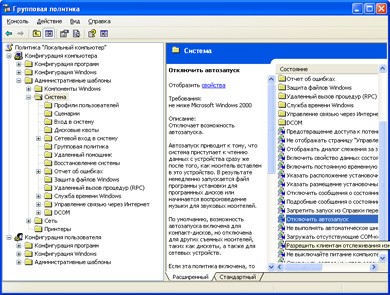 В появившемся окне групповой политики выбираем: Административные шаблоны/Система/Отключить Автозапуск