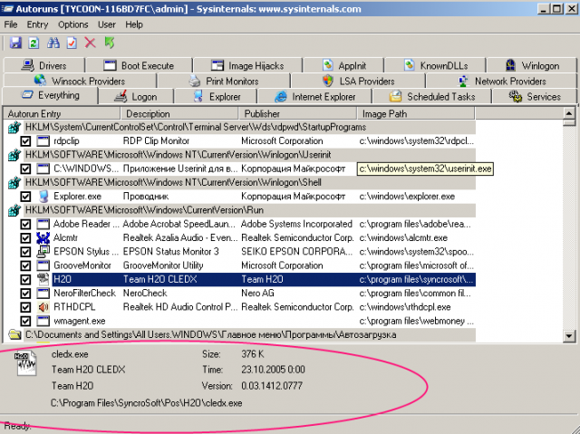 Сводная информация о конкретном объекте выдается при выделении программы в нижней части Autoruns (обведено красным цветом)