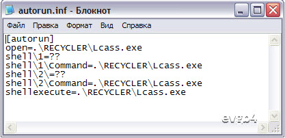 Принцип действия вышеописанных вирусов одинаковый. Вирус прописан на диске в виде нескольких отдельных файлов. Один из которых носит название autorun.inf, главная задача которого указывать путь к исполняемому файлу на диске. Чтобы было немножко понятнее – приведу пример.