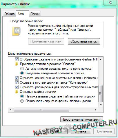 Если у Вас Windows 7, нужно пройти немного другой путь: ”Пуск-Панель Управления-Оформление и персонализация-Параментры папок-Вкладка Вид”.