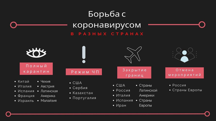 Всемирная организация здравоохранения 12 марта объявила вспышку нового коронавируса пандемией. К настоящему времени количество подтвержденных случаев заражения превысило 215 тысяч. Способы борьбы правительств различных стран мира с эпидемией коронавируса представлены в данном обзоре