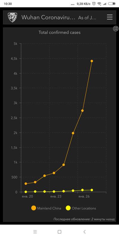 Решил все занести на графики данные по коронавирус. Источник чисел - Медуза. Собственная трактовка: по динамике прироста заражений видно, что с 24ого числа успехи Китая растут - ежедневный прирост заражений, выраженных в процентах, уверенно падает. Если эта динамика продолжится (-10% каждый день), вирус будет остановлен уже через несколько дней, а число подтвержденных случаев заражения может остановиться уже на отметке 5-6 тысяч. Это оптимистичный сценарий.