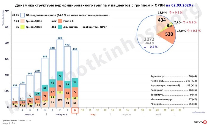 - Добавлены данные по структуре выявленных инфекций и удельному весу выявленных случаев гриппа среди госпитализированных взрослых больных за 9-ю неделю 2020 года (24.02. – 01.03.2020 г.)
