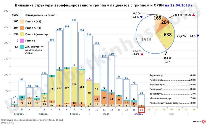 - Добавлены данные по структуре выявленных инфекций и удельному весу выявленных случаев гриппа среди госпитализированных взрослых больных за 16-ю неделю 2020 года (13.04. – 19.04.2020 г.)