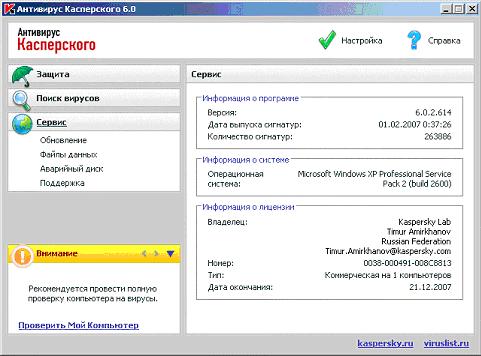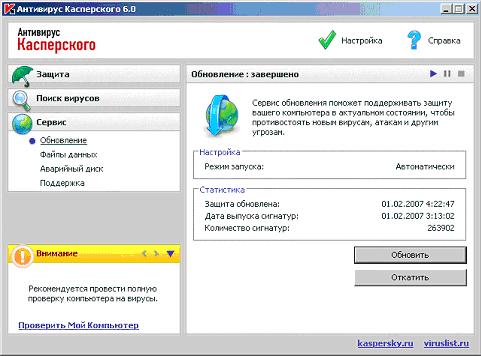 В ходе выполнения этой лабораторной работы были получены первые навыки работы с Антивирусом Касперского 6.0 - изучен внешний вид всех четырех основных окон интерфейса , получены знания о механизме управления основными задачами проверки на наличие вирусов (постоянная защита и поиск вирусов) и обновления.