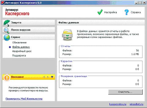 - Резервное хранилище - еще одно особое хранилище файлов. Антивирус Касперского во время своей работы самостоятельно не удаляет ни один файл насовсем. Кроме записи в систему статистики, все файлы, над которыми антивирус будет проводить какие-нибудь действия (удалять или лечить) предварительно всегда копируются в Резервное хранилище. Любой файл из резервного хранилища также можно восстановить. Это может быть полезно, например, в случае заражения очень нужного в работе файла, причем таким вирусом, который не допускает лечение. Однако действовать при этом нужно очень осторожно и в большинстве случаев рекомендуется файлы из Резервного хранилища удалять