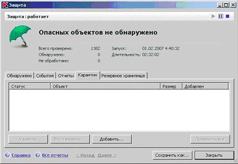 - Отчеты - статистика работы программы: результаты выполнения разных задач, перечень событий в работе постоянной защиты и пр.