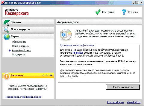 Аварийный диск следует создать сразу после установки Антивируса Касперского и проверки его работоспособности 6 Принципы диагностики изучаются в следующей лабораторной работе . После этого о нем можно забыть, чтобы вернуться только в случае повреждения системы.