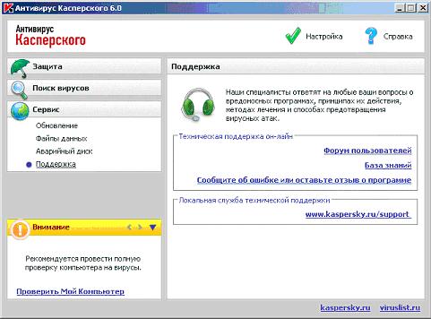 Последний раздел называется Сервис. В нем собраны все остальные элементы управления Антивирусом Касперского: