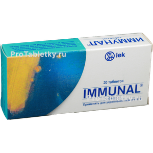 Вспомогательные вещества: кремния диоксид коллоидный, лактоза, магния стеарат, натрия сахаринат, ванилин, ароматизатор вишневый. 10 шт. - блистеры (2) - пачки картонные. Препарат в форме раствора для приема внутрь назначают взрослым и подросткам старше 12 лет по 2.5 мл 3 раза/сут; детям в возрасте от 6 до 12 лет - по 1.5 мл 3 раза/сут; детям в возрасте от 1 года до 6 лет - по 1 мл 3 раза/сут. Препарат в форме таблеток назначают взрослым и подросткам старше 12 лет по 1 таб. 3-4 раза/сут; детям в возрасте от 6 до 12 лет - по 1 таб. 1-3 раза/сут; детям в возрасте от 4 до 6 лет - по 1 таб. 1-2 раза/сут. Для достижения клинического эффекта Иммунал ® следует принимать не менее 1 недели. Продолжительность непрерывного приема - не более 8 недель. Таблетки следует запивать водой. Для маленьких детей рекомендуется растолочь таблетку и смешать с небольшим количеством воды, чая или сока. Для облегчения правильного дозирования раствора для приема внутрь в каждую упаковку вложена градуированная дозировочная пипетка. Перед приемом необходимое количество капель следует развести в небольшом объеме воды. Симптомы интоксикации вследствие передозировки препарата не отмечены. Раствор для приема внутрь содержит этанол, в связи с чем препарат может усиливать или изменять эффект других лекарственных препаратов. Клинически значимое лекарственное взаимодействие отмечено при применении антибиотиков группы цефалоспоринов (цефамандол, цефотетан, цефменоксим, цефоперазон, моксалактам) и одновременном приеме этанола (даже в небольших количествах). Реакция пациента характеризовалась покраснением лица, тошнотой, повышенным потоотделением, головной болью, учащенным сердцебиением. В связи с этим Иммунал ® в форме раствора для приема внутрь не следует применять одновременно с вышеперечисленными антибиотиками. Прием Иммунала возможен только через 3 дня после окончания курса лечения указанными цефалоспоринами. При одновременном применении с иммунодепрессантами отмечается взаимное ослабление действия. Сообщения о каком-либо взаимодействии с другими лекарственными средствами отсутствуют. В отдельных случаях возможно развитие реакций повышенной чувствительности: кожная сыпь, зуд, головокружение, бронхоспазм, ангионевротический отек, синдром Стивенса-Джонсона, анафилактический шок, снижение АД, одышка. Прочие: лейкопения (при непрерывном применении более 8 недель).
