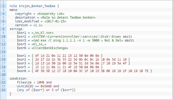 Основная троянская программа детектируется продуктами Лаборатории Касперского как Trojan-Banker.Win32.TwoBee.gen. Атака состоит из трех модулей, отвечающих, соответственно, за запуск троянца, подмену реквизитов в документах и удаление вредоносной программы.