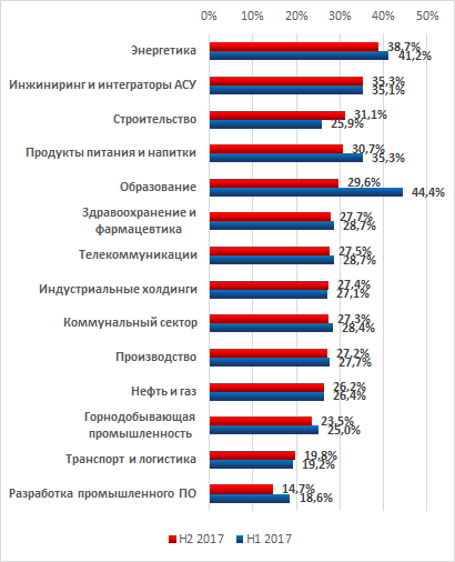 Специалисты проследили различие в статистике атак, распределенной по индустриям, между двумя полугодиями 2017 года.