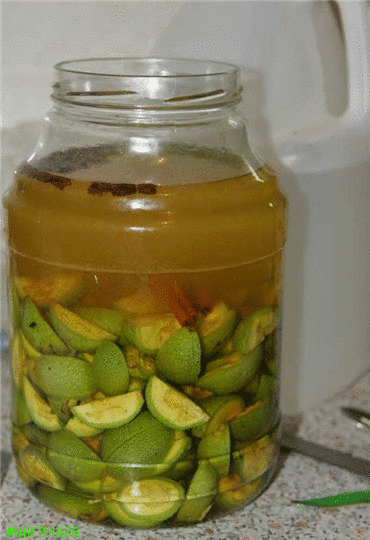 Для приготовления настойки треть банки заполнить целыми или разрезанными пополам зелёными орехами, залить водкой или 40% спиртом. Настаивать 2 недели в тёмном прохладном месте.