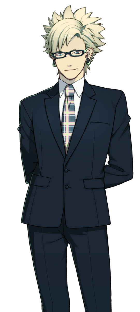 Although Virus may resemble Trip a lot, they are not actually twins. Virus' hair is pale blonde, spiked up at the back with his bangs on the right. His eyes are bright blue and he wears a pair of glasses, which are black with green arms. As accessories, he wears a pair of earrings that match the ones Trip wears. His tie is checkered to compliment Trips' clothes, and he wears a fitted black suit, as well as white shoes. Additionally, he wears a Morphine pin on his suit.