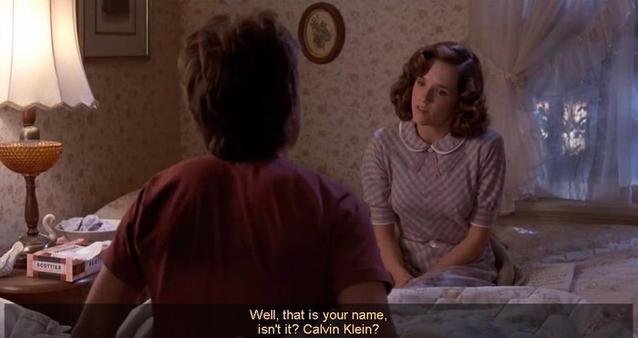 В 1985 году бренд был известен в основном только в США, европейским зрителям это имя ничего не говорило. Поэтому, например, при французском дубляже имя Calvin Klein было заменено на Pierre Cardin.
