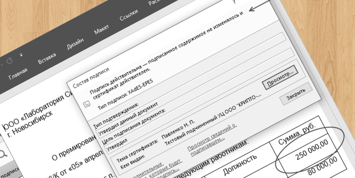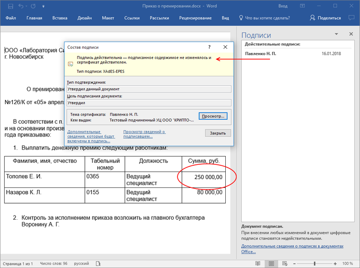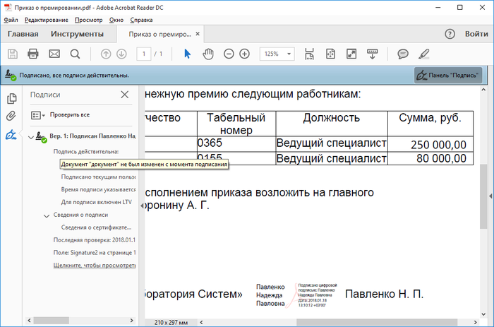 • Получив подписанный prikaz.pdf, бухгалтер открывает его в Adobe Reader и видит размер премии 250 000 руб., целостность подписи при этом не нарушена