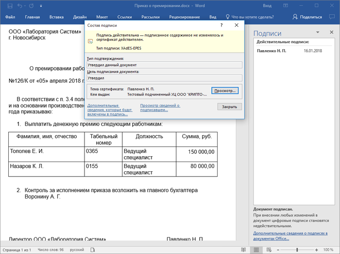 • Директор подписывает prikaz.docx усиленной квалифицированной ЭП с помощью КриптоПро Office Signature 2.0. Получаем электронный подлинник: