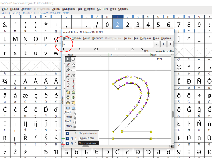 • С помощью бесплатной программы FontForge модифицируем файл шрифта NotoSans-Regular.ttf, заменив векторное изображение глифа 1 на изображение глифа 2