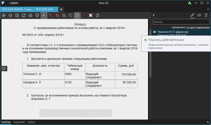 • Получив подписанный prikaz.xps, бухгалтер открывает его в Pilot-ICE, проверяет целостность ЭП и видит тот же размер премии, который был на момент подписания документа — 150 000 руб. Атака на XPS не удалась.