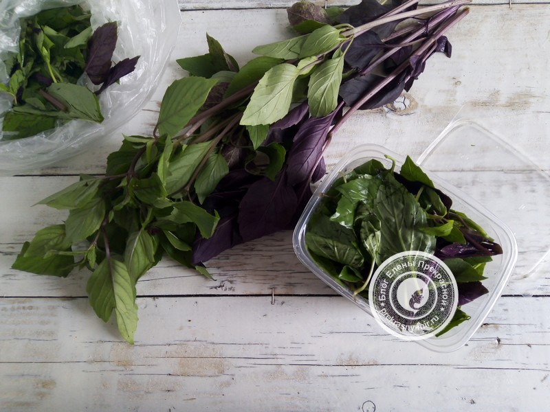 Более щадящей для растения. Это заморозка в два этапа, что позволит сохранить в базилике больше полезных веществ и микроэлементов, а также упростит отделение части зелени, если не будет необходимости использовать всею партию замороженного базилика из одного контейнера. Зелень базилика промываем под проточной водой, просушиваем, листочки раскладываем на доску или противень и отправляем на полчаса в морозильную камеру. Затем вынимаем его и перекладываем замороженную зелень в специальную удобную емкость и отправляем в морозилку уже на постоянное хранение.