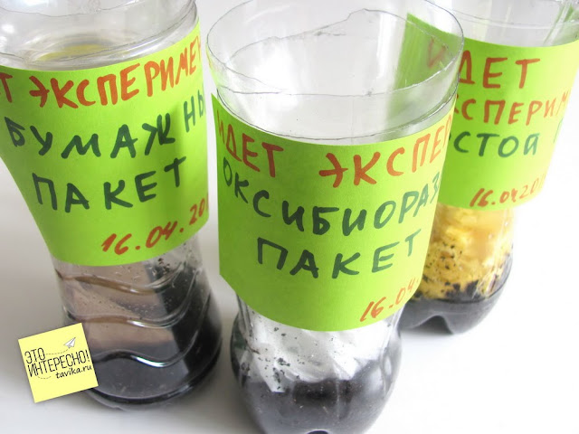 - Наклеиваем на бутылку этикетку с названием материала, из которого сделан пакет и датой начала эксперимента.