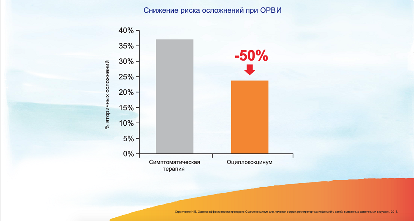 Все это обусловливает высокую эффективность препарата — при лечении Оциллококцинумом ОРВИ протекает в 2 раза легче и выздоровление происходит на 4—5 сутки. 10 При этом препарат снижает частоту развития вторичных осложнений на 50%. 11