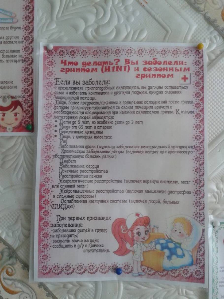 С детьми нашего детсада, в каждой группе проводим с детьми беседы на тему: «Защитники организма от гриппа и простуды«, «Я прививок не боюсь,если надо уколюсь. «Для укрепления иммунитета детей в детском саду надо соблюдать рекомендации: -Создавать хорошее настроение. -Смазывать пазухи носа оксолиновой мазью или промывание носоглотки солевым раствором. -Уборка помещения. -Проветривание. -Закаливание. -Прогулки на свежем воздухе. -Витаминизация. Кушать овощи и фрукты. -Гигиена (мыть руки). -Одеваться по сезону и погоде. а главное- Вакцинация против гриппа. Перед детьми поставила проблему как сделать так, чтобы эту информацию о профилактике гриппа,как не заразиться гриппом и простудой узнали и наши родители и сотрудники детсада (повара,сторожа,заведующая и другие сотрудники).Дети стали предлагать рассказать всем,порекомендовать посмотреть информацию о гриппе по телевизору или в интернете. Кто то предложил отправить сотрудников в больницу,чтобы им там рассказали врачи. Затем мы с детьми вспомнили где получают информацию,новости родители детей. Перечислив телевизор,рекламу,интернет вспомнили где дедушка узнает новости — через газету и решили с детьми сделать свою стенгазету. Делали ее используя обрывную аппликацию,подбирая вырезки. Наша газета всем понравилась. Желаем всем здоровья!
